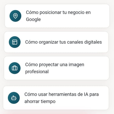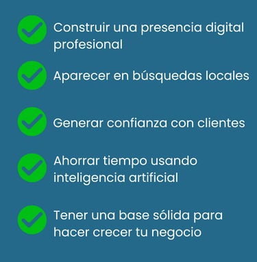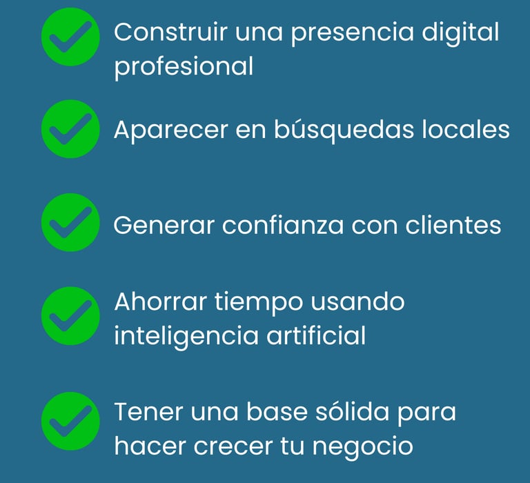 Aprende paso a paso cómo hacer que tu negocio se vea profesional, aparezca en Google y empiece a atraer clientes usando herramientas digitales e inteligencia artificial. Incluye guía práctica + biblioteca de prompts + recursos para lanzar tu negocio con una presencia digital sólida.
